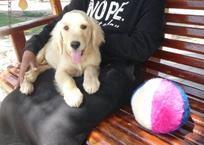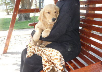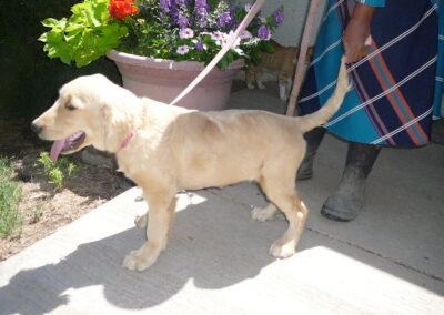 Goldilocks with Mangas produced a large litter on March 5. Both parents are AKC and OFA hip and elbow certified. The price is $2300. We sell with the first vaccination, a microchip and several dewormings. These pups appear to be mostly darker but a few take after their father and are light colored. Also if you like a smaller Golden this might be the litter for you as the Mom is small. We keep up on the vaccinations so they have had their 3rd shot at 12 wks.